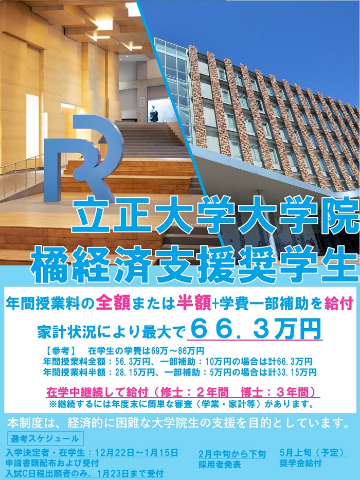 This is a new scholarship system unique to Rissho University that provides scholarships for challenges faced after enrolling at university.
