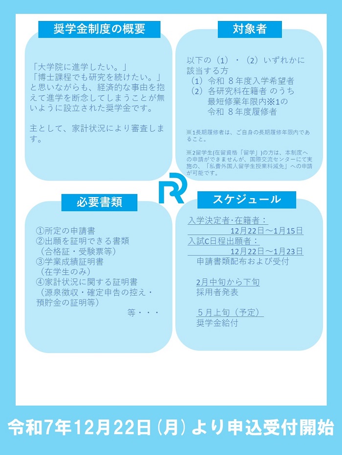 By providing support tailored to the characteristics of the graduate school to students who are working hard on their studies, the aim is to cultivate excellent researchers and human resources who will be widely active in society (there is no obligation to return the funds after graduation).