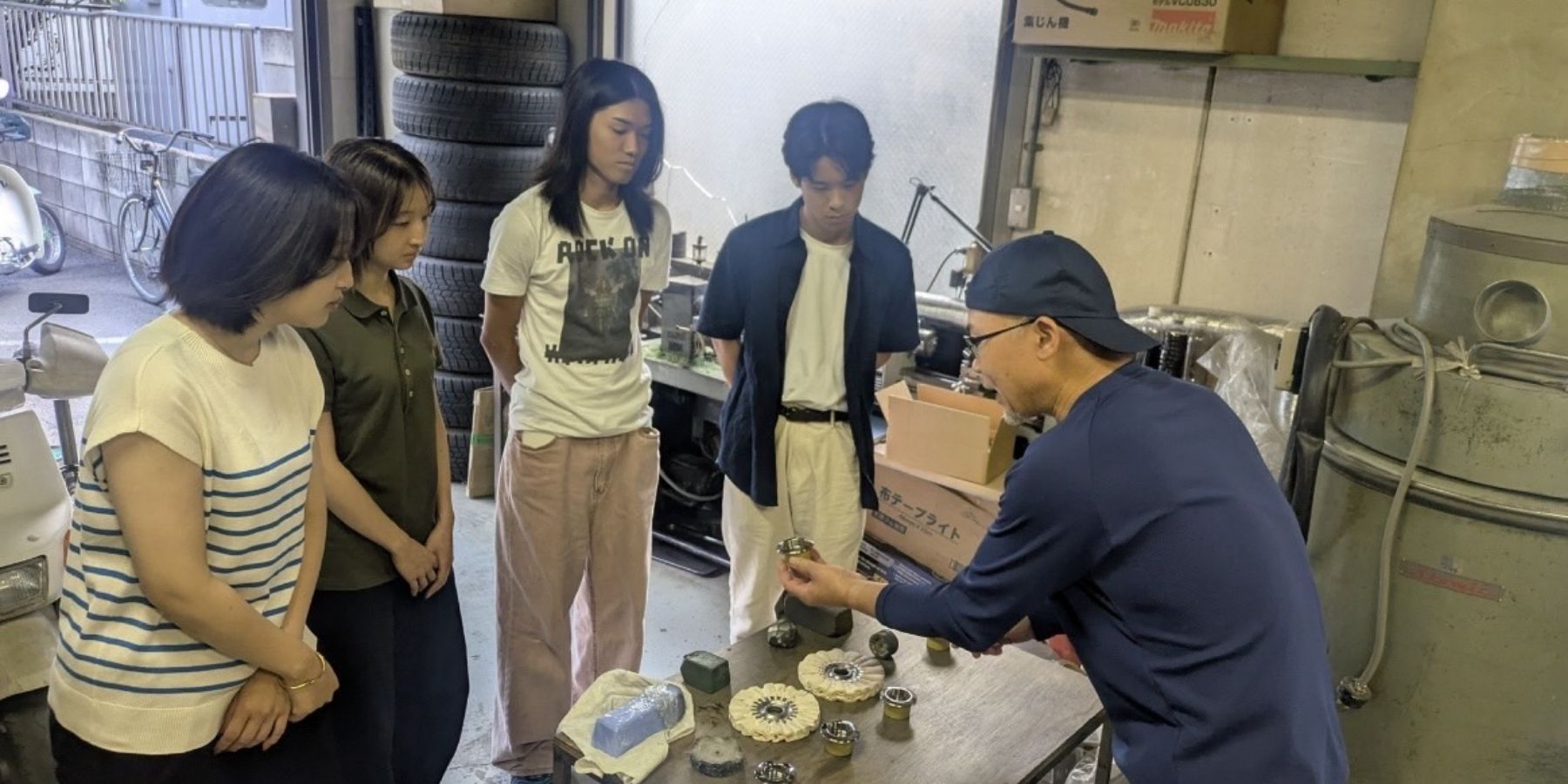 金属の研磨加工を行う中央バフ製作所では、二日目に研磨機械であるバフ制作体験、四日目にはバフを取り扱う取引先を訪問し、バフ事業への理解を深めました。ゲームやグループワークを通して社員との交流も行い、経営やグローバルといった観点からの意見交換を実施しました。さらに、五日目には株式会社ROOM810の丸山社長によるブランディング講義も受講し、企業活動の幅広さを学びました。
