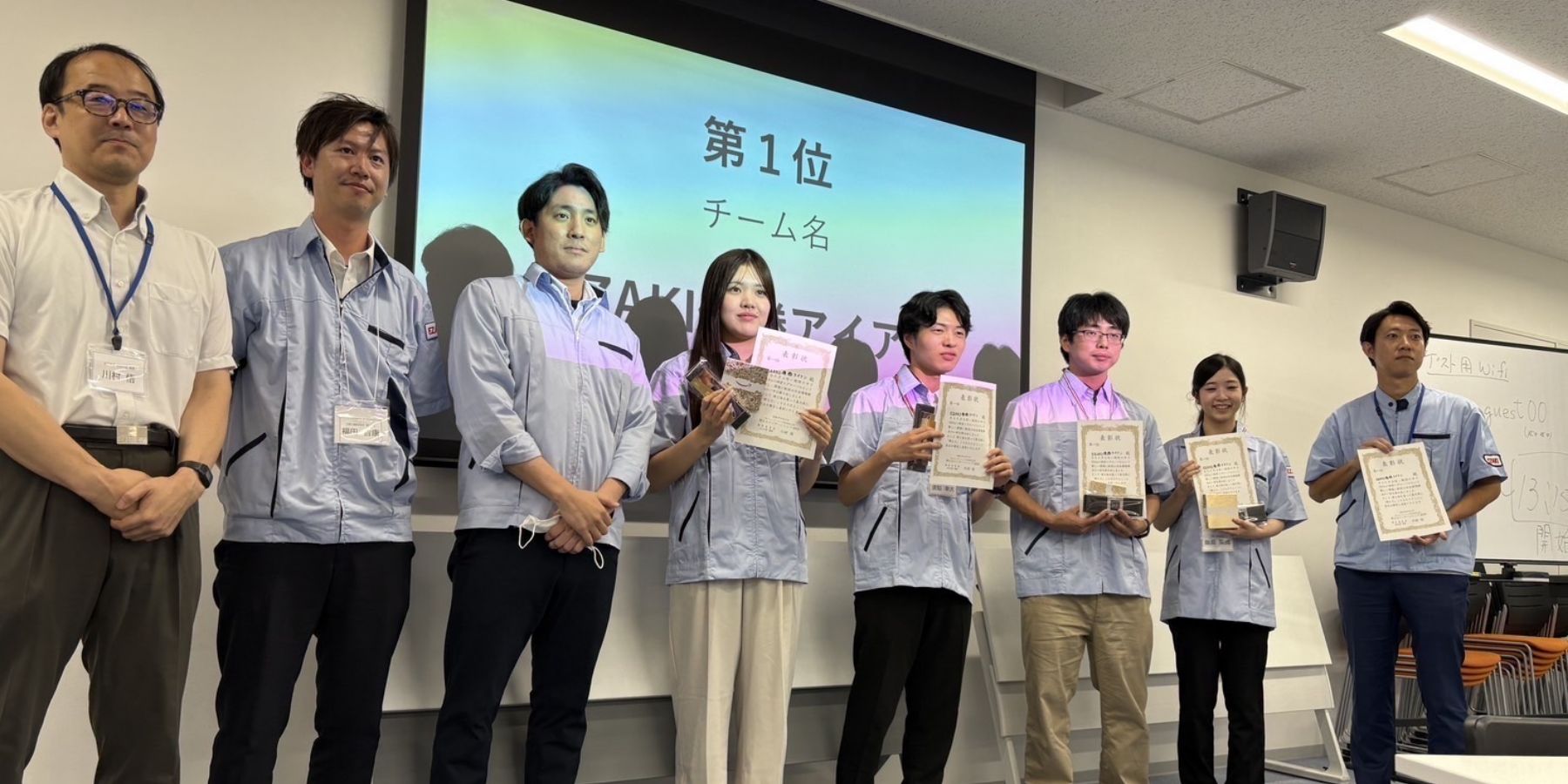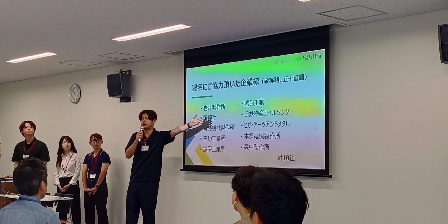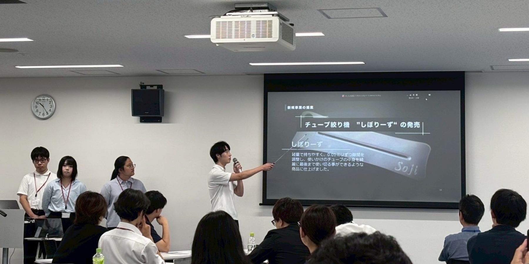 最終日、プログラムを通じて得た学びや企業への提案について各チームがプレゼンテーションを行いました。企業での実習やフィールドワークをもとに課題を分析し、改善策や新たな企画を提案しました。発表内容には、自社製品を活用した新商品の開発、製造業の現場における効率化に関する提案、企業や商品の魅力を広く知ってもらうためのイベント企画などがみられました。
