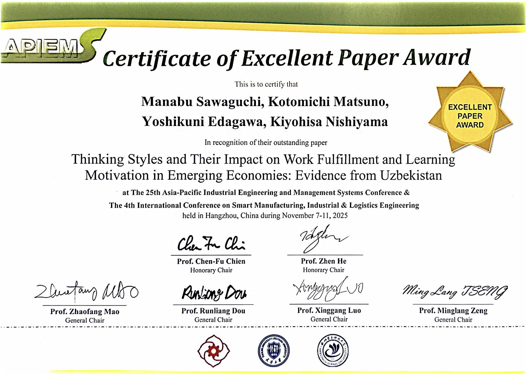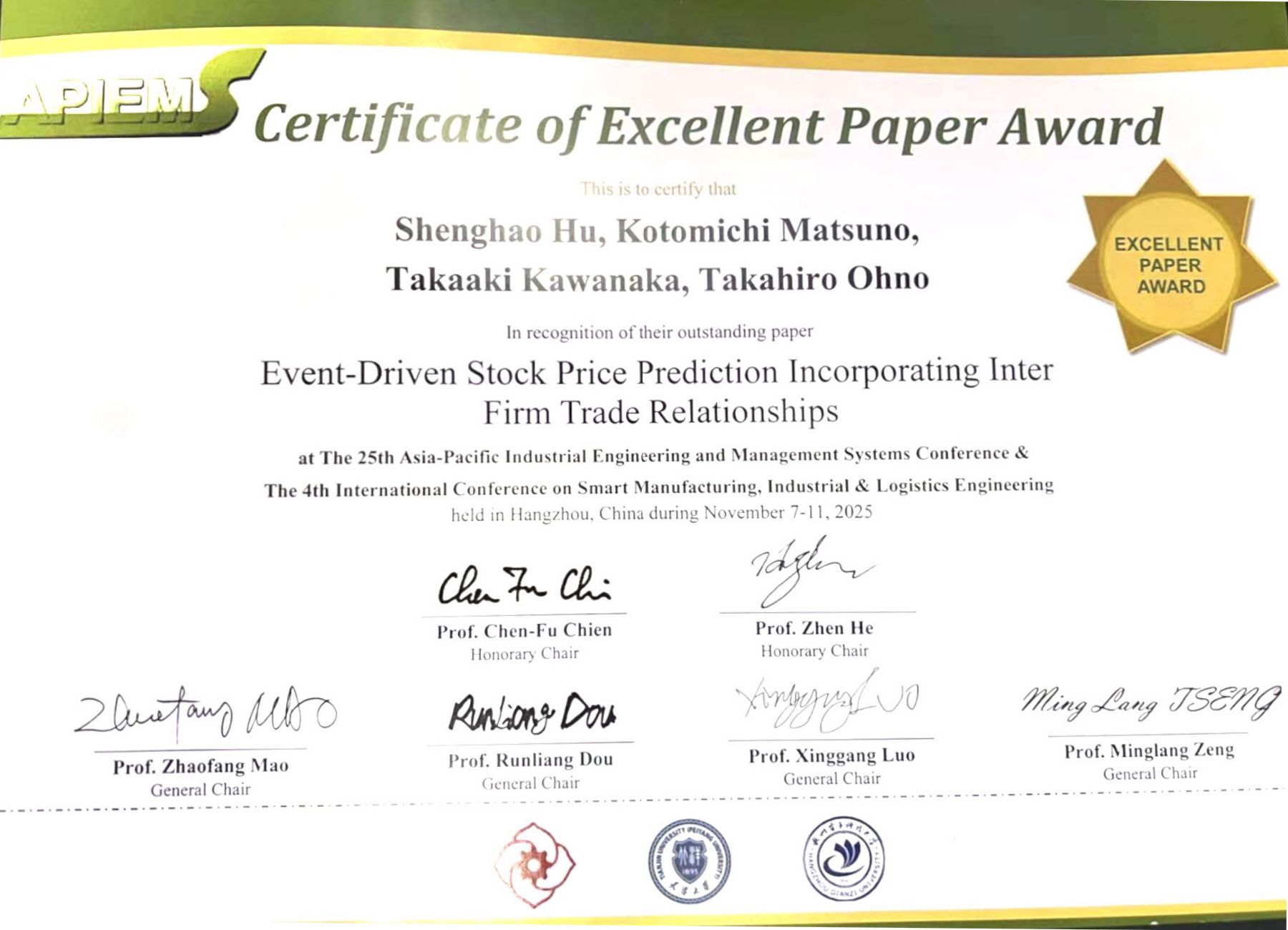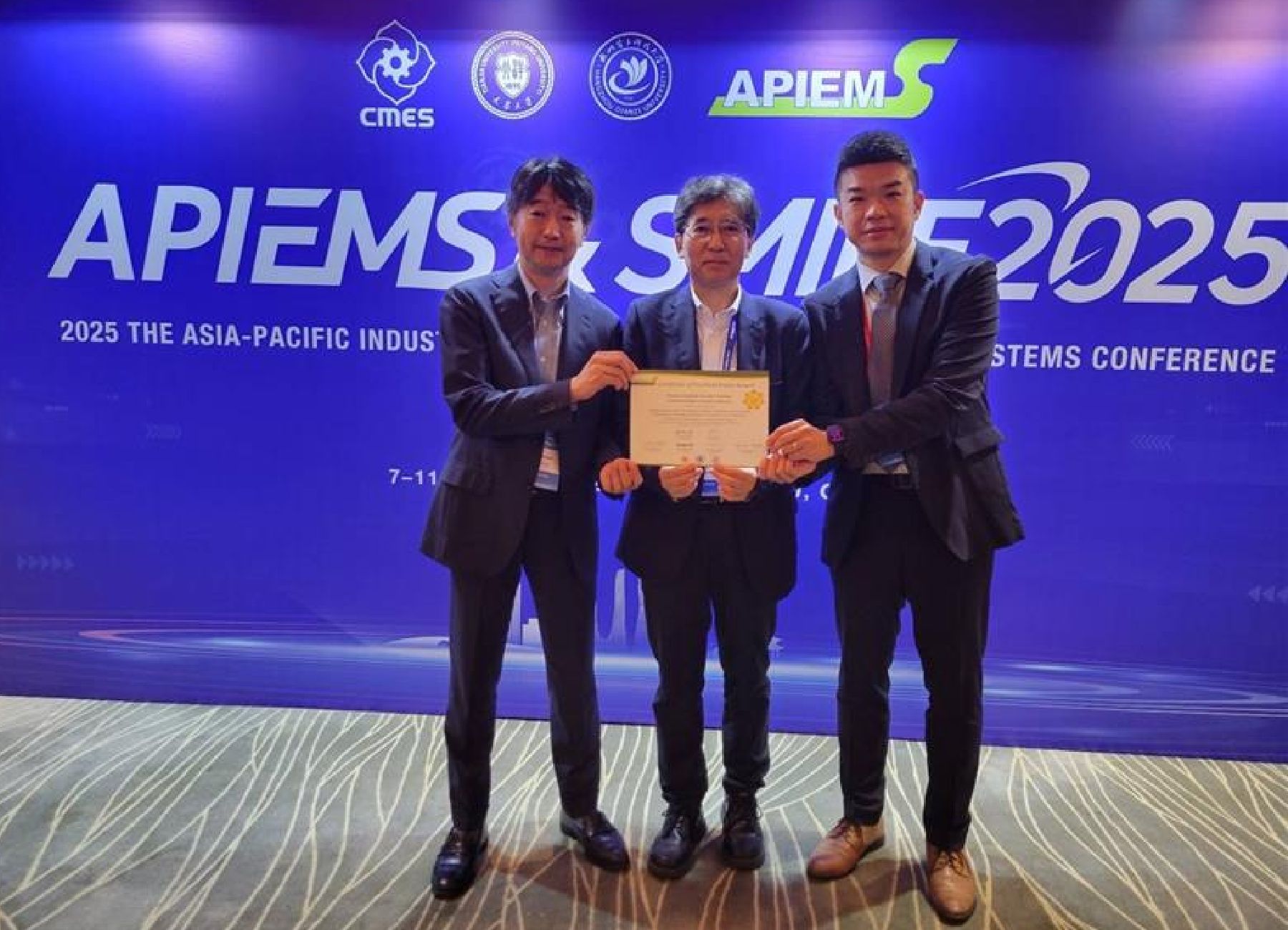 本学部の松野思迪講師が、2025年11月7日~11日に中国・杭州で開催されたAPIEMS2025 (The 25th Asia-Pacific Industrial Engineering and Management Systems Conference) & SMILE2025 (The 4th International Conference on Smart Manufacturing, Industrial & Logistics Engineering)において、共著した2件の論文がExcellent Paper Awardを受賞しました。