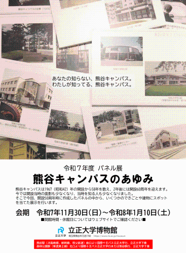 11月30日を除く特別開館日に、展示ディレクターが開設当時のキャンパスを振り返りながら、熊谷キャンパスの現在をご案内するキャンパスツアーを実施します(事前申込不要)。参加希望者は午前10時50分までに博物館へご集合ください。