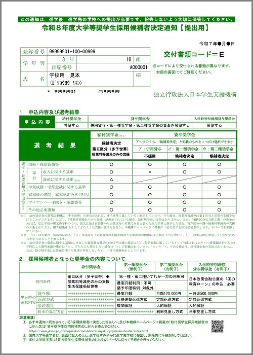 「令和8年度大学等奨学生採用候補者決定通知」(右図)をお持ちの方