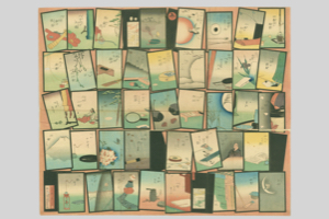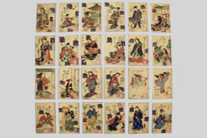 本資料は、「絵(紙)双六」のなかでもサイコロの目によって飛ぶ先がマスの中で指示されている「飛び双六」。タイトルは「七艸」のマスに描かれた門の聯「四季の花やしき」に拠る。本資料のマスはカルタを模しており、例えば「一句うかびました」(筆と紙)、「二日やひと」(灸の道具)、「三国いち」(富士山)、など、数字を冠する言葉とその絵がある。左隅に、「板元 [南]伝馬丁壱丁目 蔦屋吉蔵梓」の記載がある。