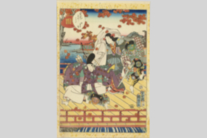 安政4年8月、江戸の森田座で上演された同名の歌舞伎を絵入り小説(合巻)にした書。日蓮の伝記を題材とする。文章は柳水亭種清(1823-1907)、絵は2世歌川国貞(1823-80)が担当している。版元は紅英堂(蔦屋吉蔵)で、安政4年8月を指す改印(検閲を受けたしるし、「改」「巳八」)がある。初版は歌舞伎の上演の年と考えられるが、本資料には安政5年開版の蔦吉版書目があるため、安政5年以降に刷られたもの。