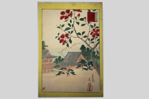 江戸の名所と花を組み合わせた錦絵の連作の1枚。山茶花(サザンカ)の奥に堀之内(現・杉並区)の寺院が描かれている。同地の寺院としては日蓮宗の妙法寺が有名。作者の喜斎立祥(1826-69)は、初代歌川広重の養女と結婚し、2世広重を名乗ったが、慶応元年(1865)に離婚した後、喜斎立祥と号した。右下隅に「蔦吉板」という版元印があるため、蔦屋吉蔵が刊行したことが分かる。