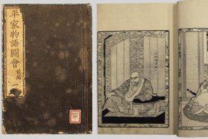 見開き絵を交えた『平家物語』の要約的な読本。著者は通俗的な解説書を多く残した高井蘭山(1762-1838)、挿絵は葛飾北斎門人の有坂蹄斎(葛飾北馬、1771-1844)。前編は文政12年の刊行だが、本資料は後編(嘉永2年)刊行後に河内屋茂兵衛が前後編を合わせて刷ったものか。刊記や見返しには、河茂の名と堂号(群玉堂)が見られる。文久2年(1862)、河茂が同書の版木を購入して届け出た記録も残る(「買板印形帳三番」)。
