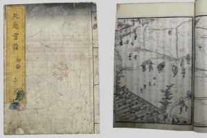 越後塩沢の商人、鈴木牧之(1770-1842)の著作で、雪に関する話や越後での生活などを挿絵付で紹介し評判を得た。初編は天保8年(刊記は天保7年)、2編は天保13年の刊行だが、本資料の初編には天保13年の刊記が見られるため、2編刊行後に両編を合わせて刷ったもの。刊記には丁子屋平兵衛と河内屋茂兵衛の名があるが、主導したのは丁子屋で、見返しや版心下部には「文渓堂」(丁子屋の堂号)の記載がある。