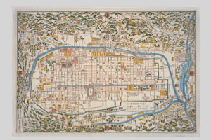 京都市街の区域を示すことに主眼を置いた多色刷りの地図。明治維新後の区画変更のため、諸図を参考に改訂したとある。明治6年(1873)に官許を得、同9年に村上勘兵衛(平楽寺)が刊行した。刊記にある平楽寺の所在地は、「上京第廿九区前之町…」。「前之町」は曇華院前町の略で、本地図にも載る。平楽寺の所在地は江戸後期から現在の平楽寺書店まで大きく変わっていない。