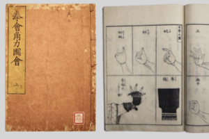 大坂の義浪と吾雀に詳細を聞いて図解した拳会相撲の入門書。拳(けん)は中国伝来の酒席遊戯で、現在のじゃんけんもその一種。本拳では、対座した2人が片手の指で数を示し合い、その合計を言い当てたものが勝者となる。数の言い方や指の出し方などに決まりがあった。本資料の巻末には「名所記総目録」があり、河内屋太助刊行の名所図会類を通覧できる。その中には『都名所図会』も含まれる。