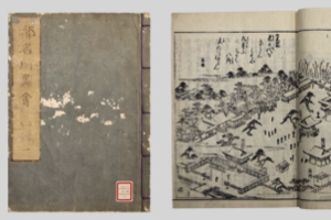 京都の名所旧跡などを挿絵入りで紹介した書。各地の「名所図会」の嚆矢となった。文章は読本作家の秋里籬島、挿絵は浮世絵師の竹原春朝斎が手掛けた。元政を開祖とする瑞光寺も挿絵付きで紹介されている。初版は、京都の書肆、吉野屋為八によって安永9年に刊行された。本書は、為八版の後印本で、奥付の「大阪心斎橋通唐物町/書林 河内屋太助梓」は入れ木による修正。