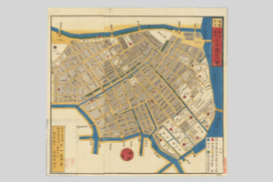 文久3年の秋に刊行された大坂の地図。同年の春に同一書肆から出された「国宝大阪全図」を縮めたほぼ同内容の図。左隅には、「竪横町」として町の大きさ、「新地年記」として開地や増地の年数が記されている。刊記に河内屋太助の名があるが、版木を所有していたのは積典堂で、河太は販売に関与しただけの可能性が高い。河太の所在地は「心斎橋唐物町」とあるが、同町も地図上に確認できる。