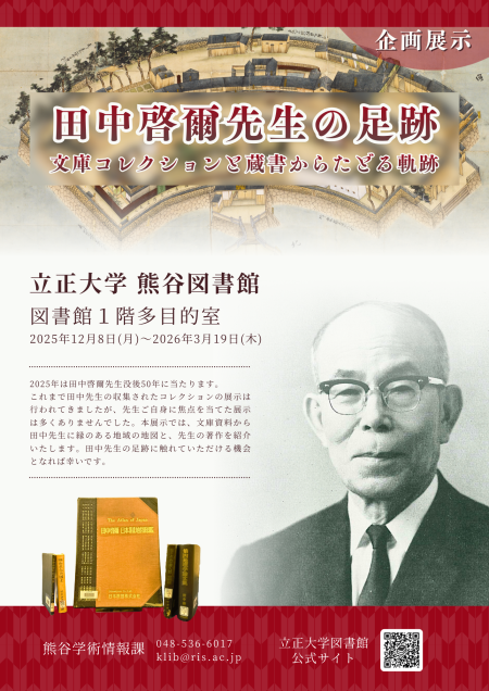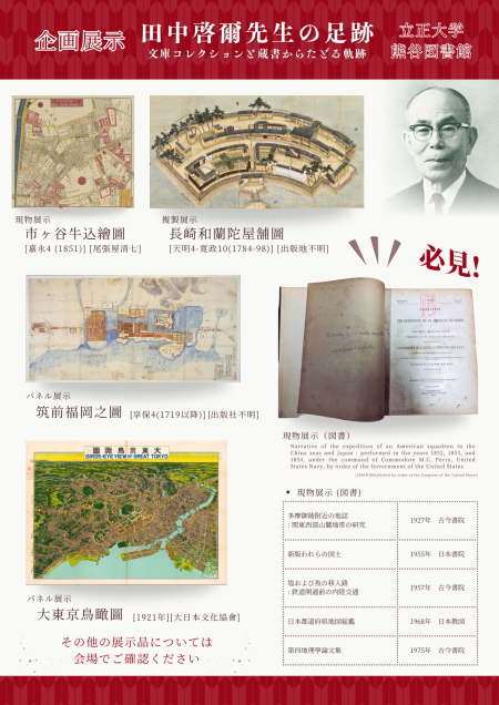 本展示では、田中先生ゆかりの地域の地図や、先生の著作を文庫資料と本学の蔵書からご紹介します。