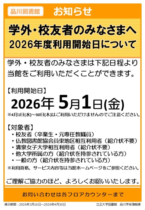 学外・校友者のみなさまは、2026年度は下記日程より当館をご利用いただくことができます。ご理解ご協力のほどよろしくお願いいたします。