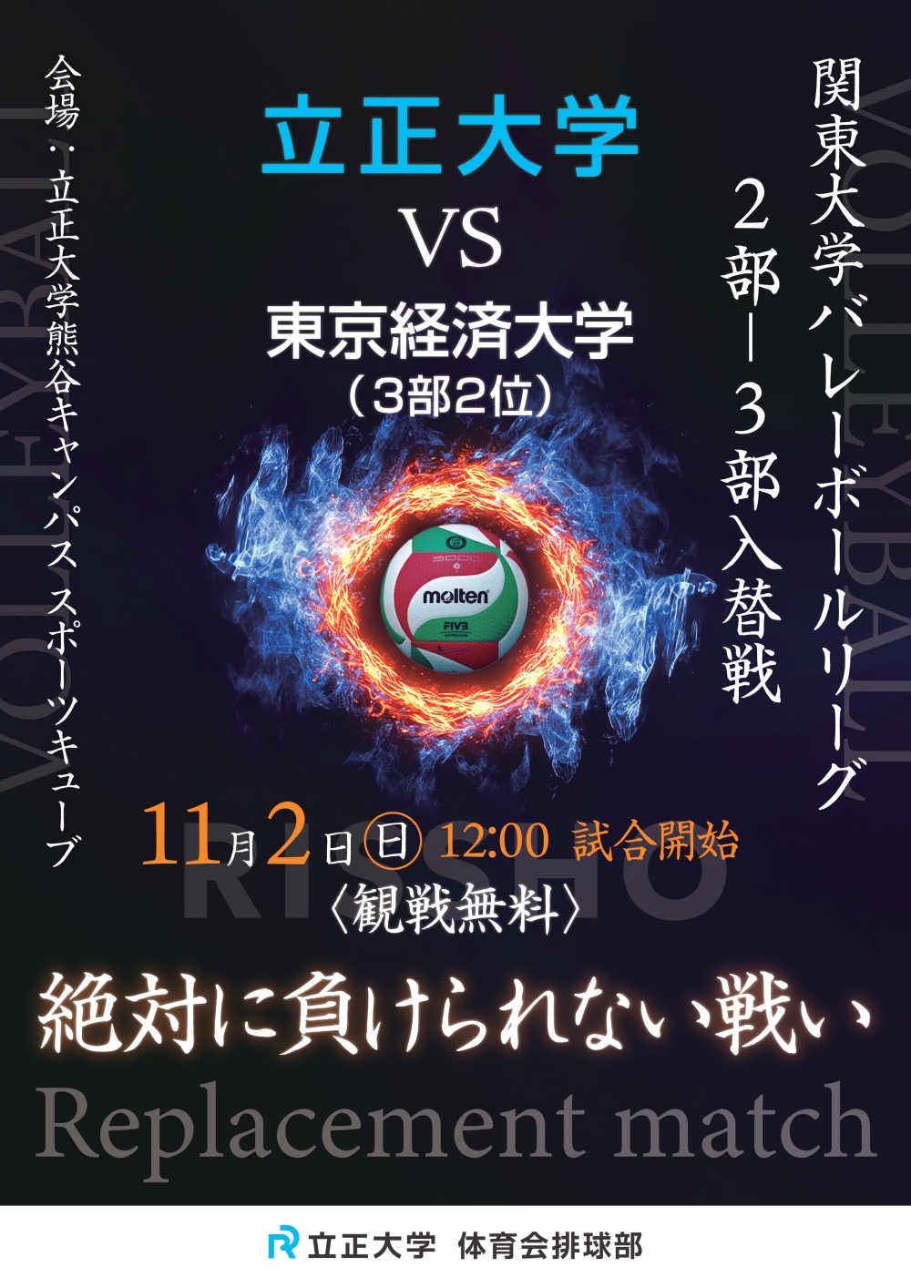 11/2(日)、本学体育会排球部が、関東大学バレーボールリーグ2部ー3部入替戦に臨みます。