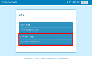 ③「メニュー」画面が表示されたら、「メールアドレス変更」をクリックします。