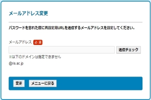 ④再設定用URLを送信するメールアドレスを入力します。メールアドレスは、rissho-univ.jp以外のアドレス(例:個人用のgmailやoutlookメール)にして、必ず「送信チェック」を行ってから「変更」をクリックしてください。