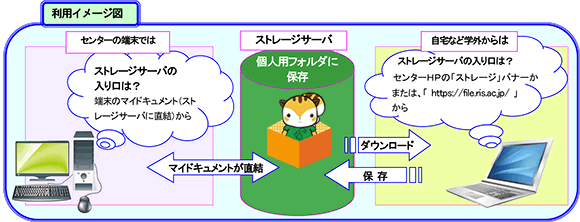 または、情報環境基盤センターWebサイト「りす@ねっと」トップページ目的別サービスリンク「ストレージ」をクリックするか、下記URLに接続します。