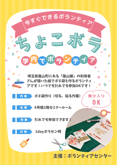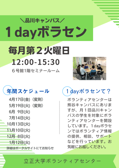 ボランティアセンターは熊谷にありますが、品川キャンパスでも月1回ボランティアセンターを開室します。