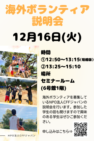 海外ボランティアを募集しているNPO法人CFFジャパンの説明会を行います。 実際に参加した学生の話も聞けますので、興味のある学生はぜひご参加ください。