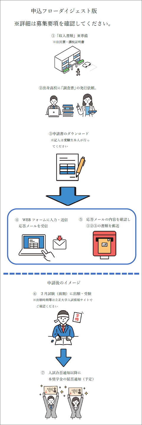 1月~2月 一般選抜2月試験(前期)への出願および受験 本奨学金の採用には、本学の一般選抜2月試験(前期)に合格し、入学手続きをおこなうことが条件となります。