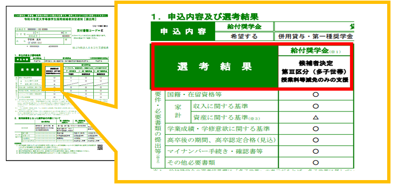 給付奨学金の選考結果欄の記載が「第Ⅳ区分私立理工農 授業料等減免のみ」「多子世帯 授業料等減免のみ」「第〇区分(多子世帯)授業料等減免のみ」は月々の給付奨学金が0円ですが、第1種奨学金の貸与も受けている場合、通学形態(自宅・自宅外通学)によって第1種奨学金の月額が調整されるためです。